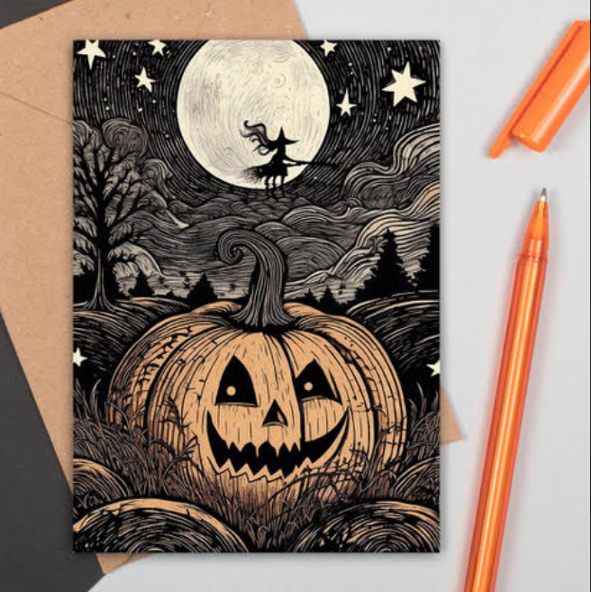 You’ll design and carve your own Halloween or autumn-inspired stamp (pumpkins, leaves, moons — your choice!) and print a piece of artwork to take home.